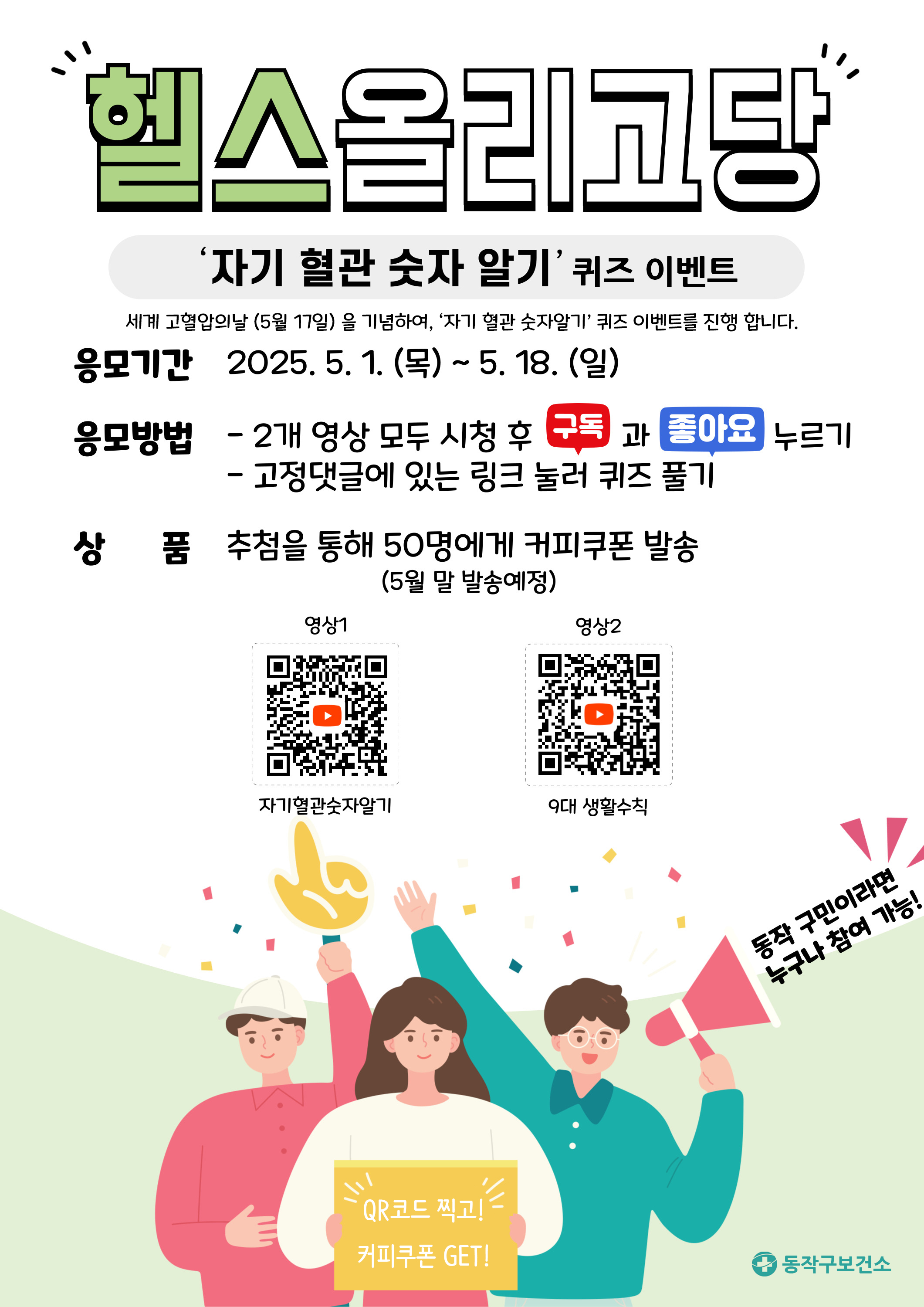 「세계 고혈압의 날(5월17일)」을 맞아 ‘자기혈관 숫자 알기’ 퀴즈 이벤트를 진행합니다.