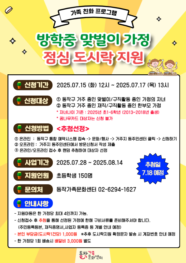 여름방학 맞벌이가정 초등학생 점심도시락 지원사업 신청 안내