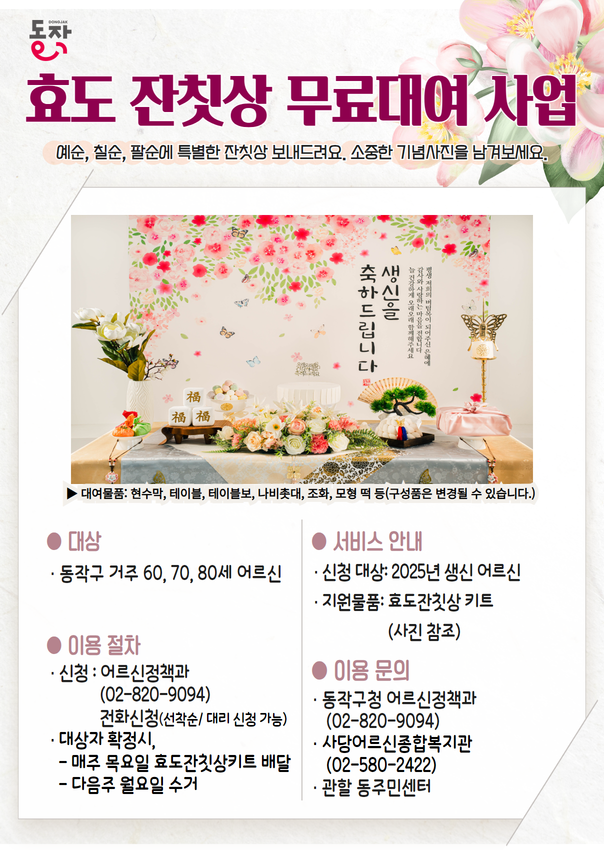 - 대 상 : 동작구 거주 환갑, 칠순, 팔순 생신맞이 어르신 (* 환갑은 취약계층 한정)