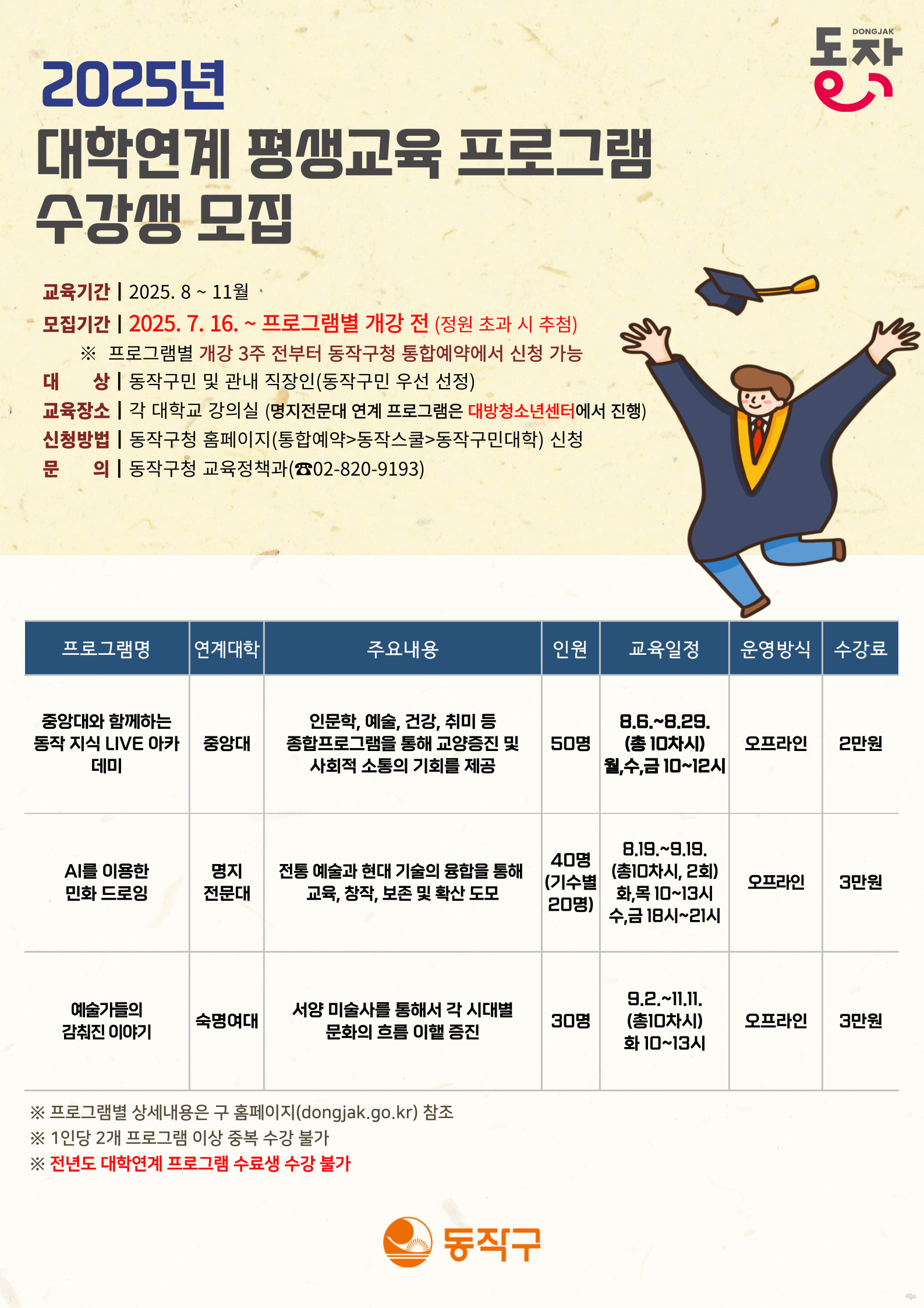 ▶ 수강 신청 바로 가기 : https://www.dongjak.go.kr/yeyak/progrm/master/reservation/list.do?tmplatSeCd=03&menuNo=1600020
