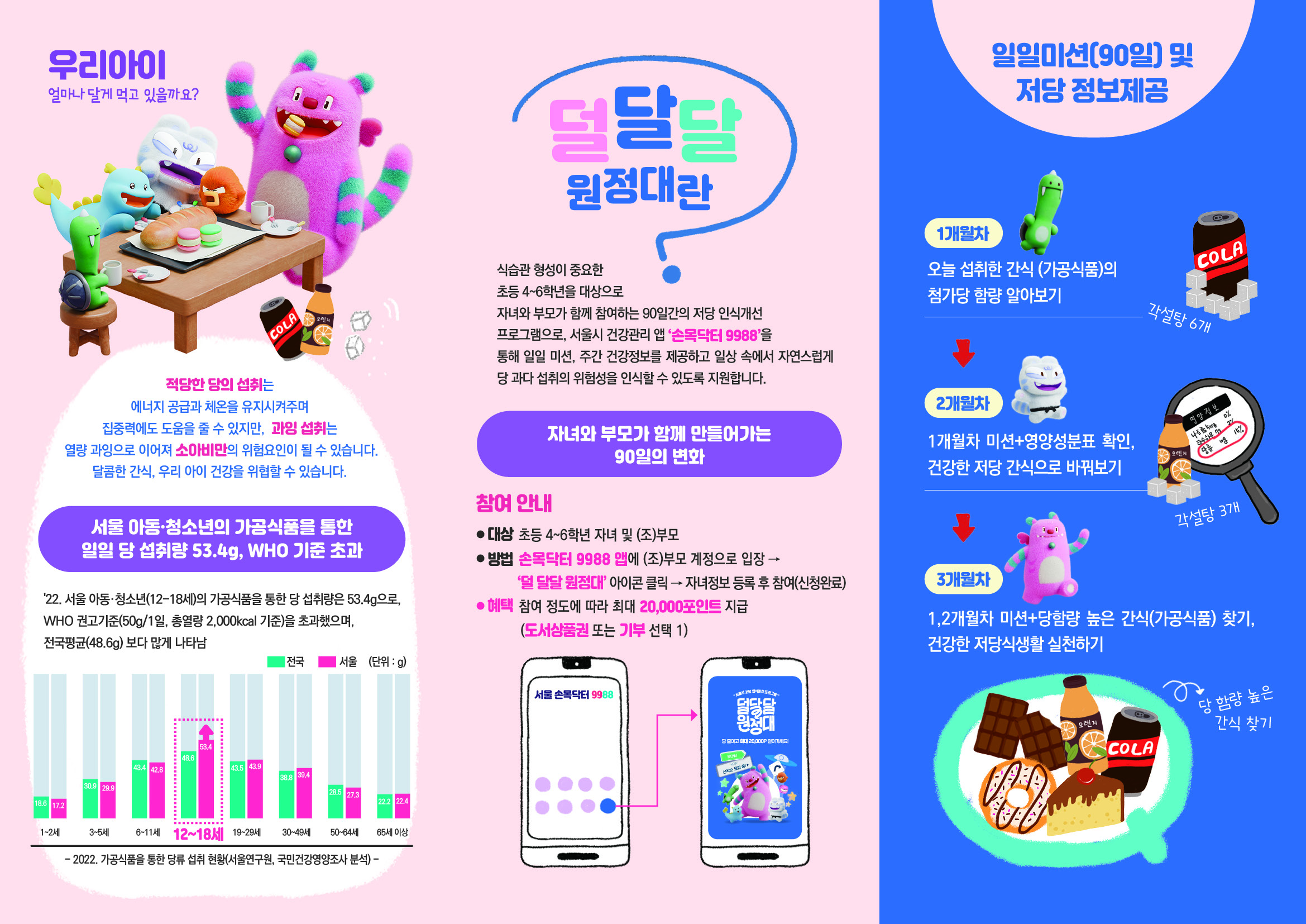 이에 따라 우리 구민 모두가 건강한 식생활을 실천할 수 있도록 「덜 달달 원정대」 프로그램을 안내드리오니, 초등학생 자녀를 두신 부모님들의 많은 참여 부탁드립니다.