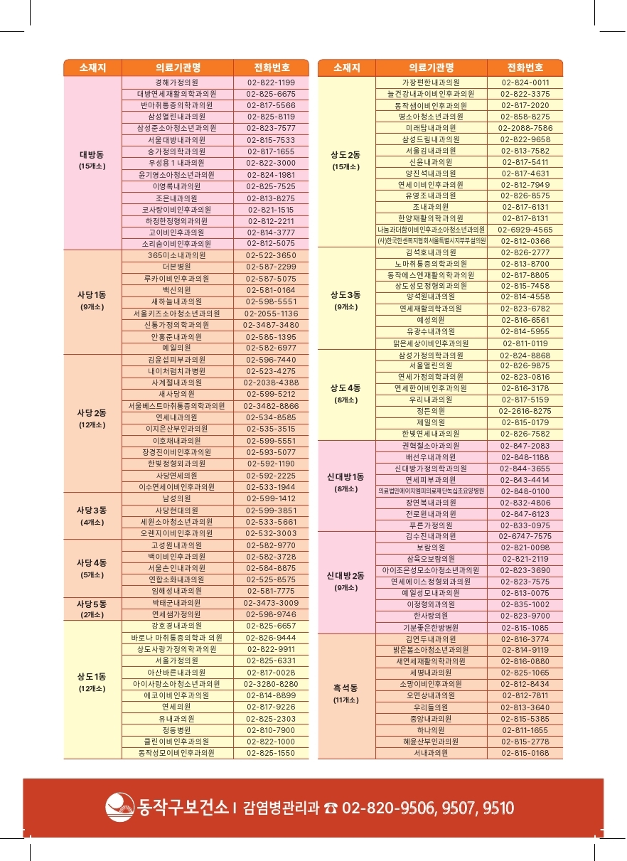 - 추가 5개소 : 노량진아산마취통증의학과의원, 사랑미소의원, 온힐가정의학과의원(노량진1동),