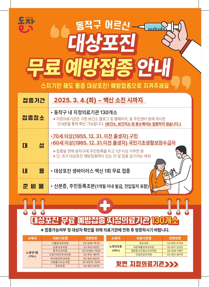 - 동작구에서는 70세 이상 어르신 대상포진 예방접종이 무료! -