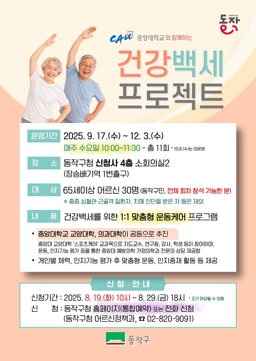 - 신 청 : 동작구청 홈페이지(통합예약) 또는 전화 신청 (동작구청 어르신정책과, ☎02-820-9091)