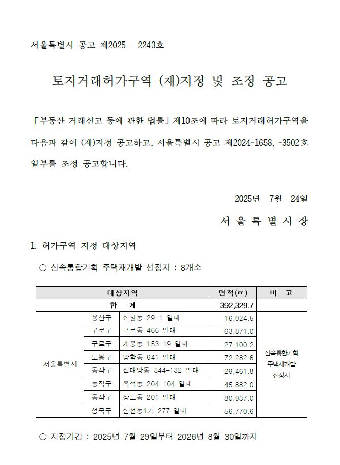 토지거래허가구역 (재)지정 및 조정 공고(신대방동, 흑석동, 상도동)