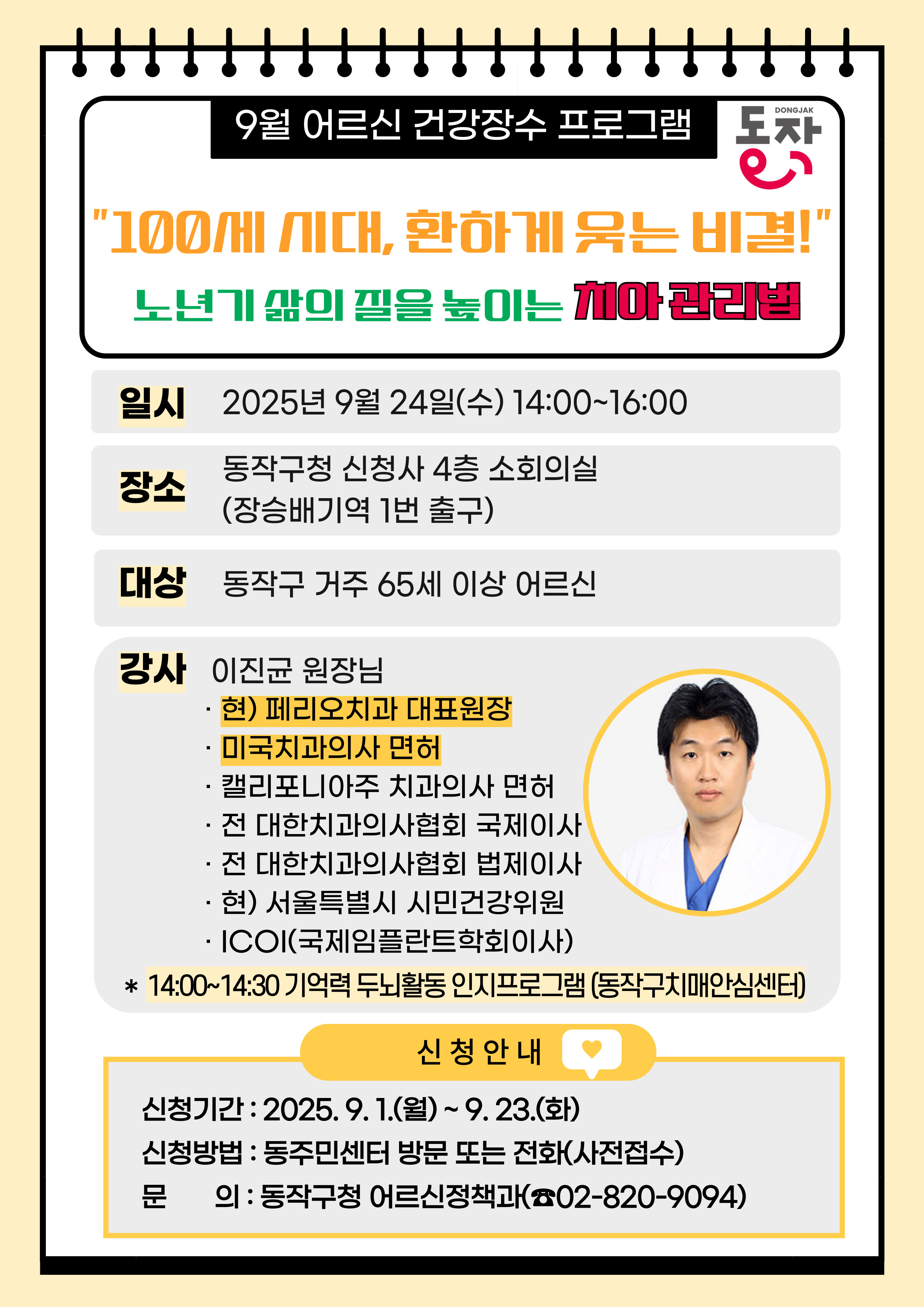 9월 건강장수 프로그램 : "100세 시대, 환하게 웃는 비결 : 노년기 삶의 질을 높이는 치아 관리법"