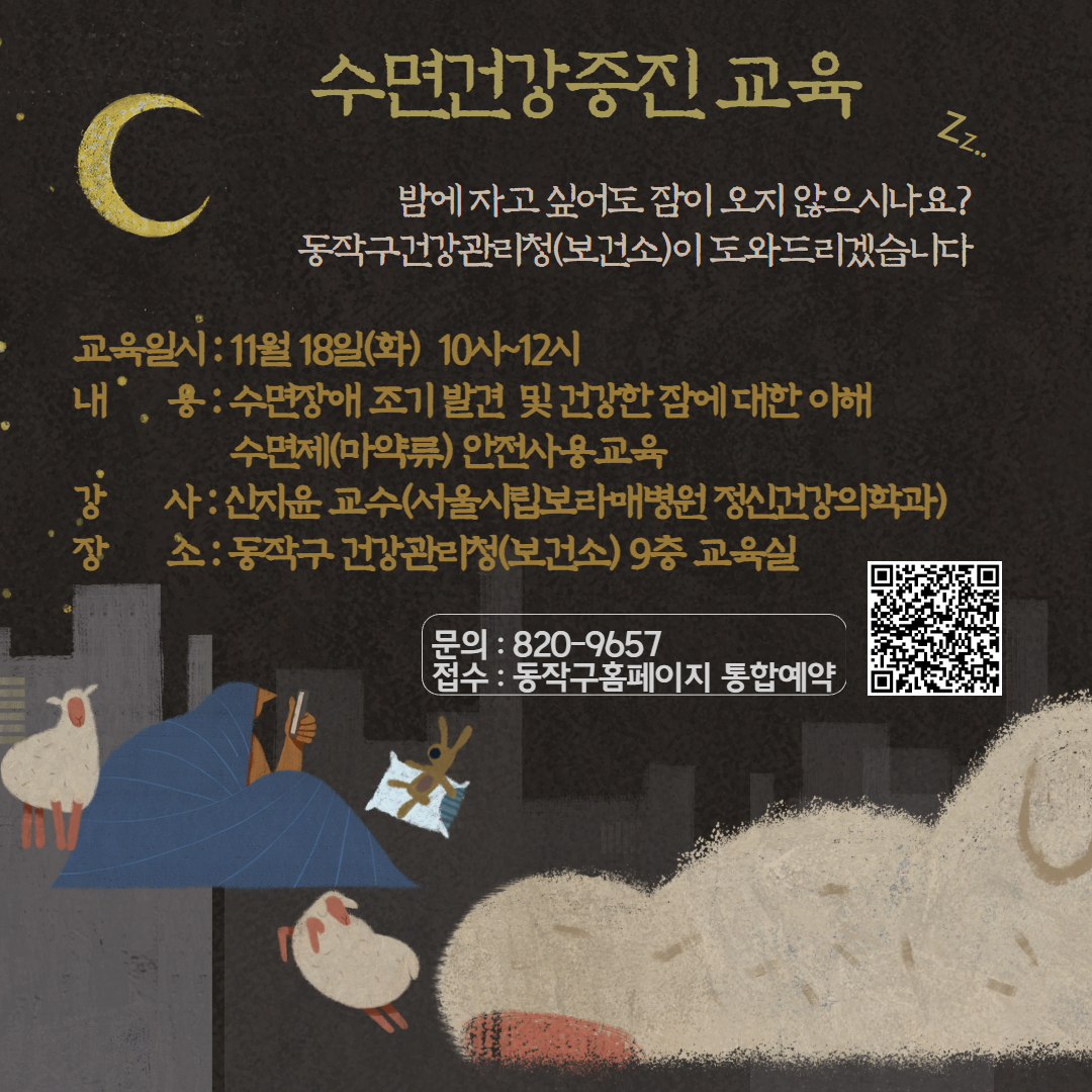 안녕하세요~ 동작구 건강관리청(보건소) 보건의약과입니다!수면건강 증진을 위한 특강(교육)을 진행하오니, 아래 포스터를 참고하여 많은 관심과 신청 부탁드립니다^^신청서 링크 : https://www.dongjak.go.kr/yeyak/progrm/master/yeyak/view.do?prgSn=8345&tmplatSeCd=91&menuNo=1600007&useAt=Y&pageIndex=1 |