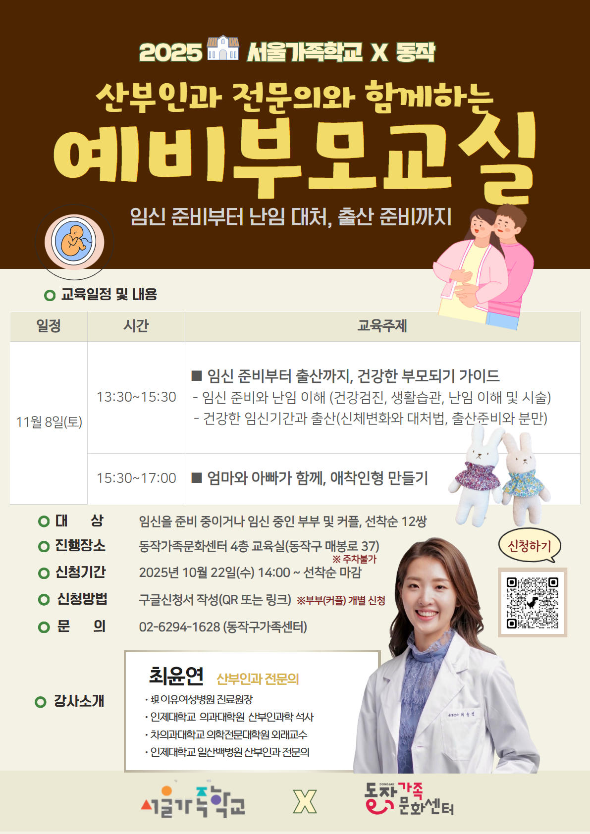 동작가족문화센터에서는 '산부인과 전문의와 함께하는 예비부모교실' 참여자를 아래와 같이 모집하오니 많은 참여 바랍니다.