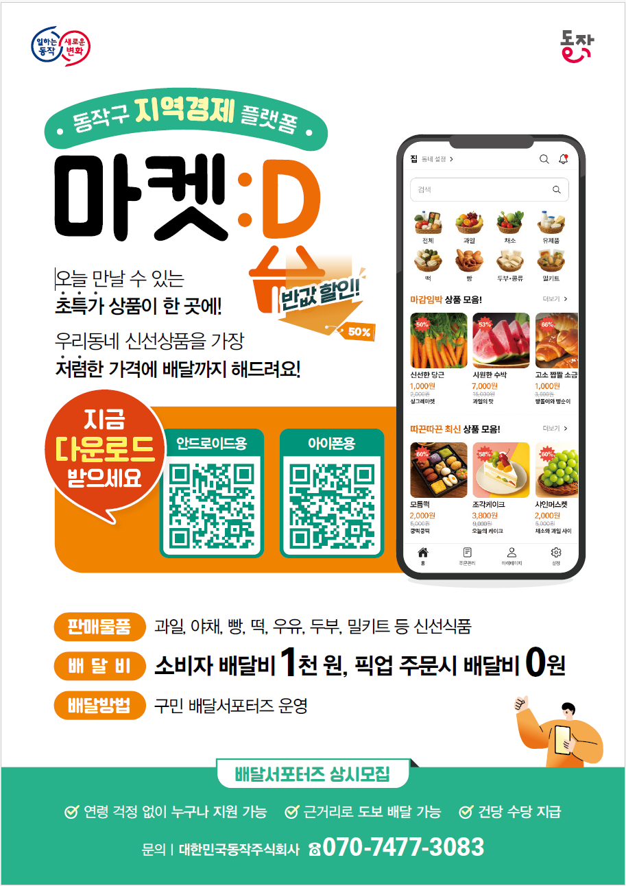 동작구의 소상공인이 직접 준비한 신선하고 믿을 수 있는 상품을 초특가로 제공하고 집 앞까지 안전하게 배송해드리는 동작구형 배달앱 ‘마켓:D’가 10월 10일에 출시 되었습니다.