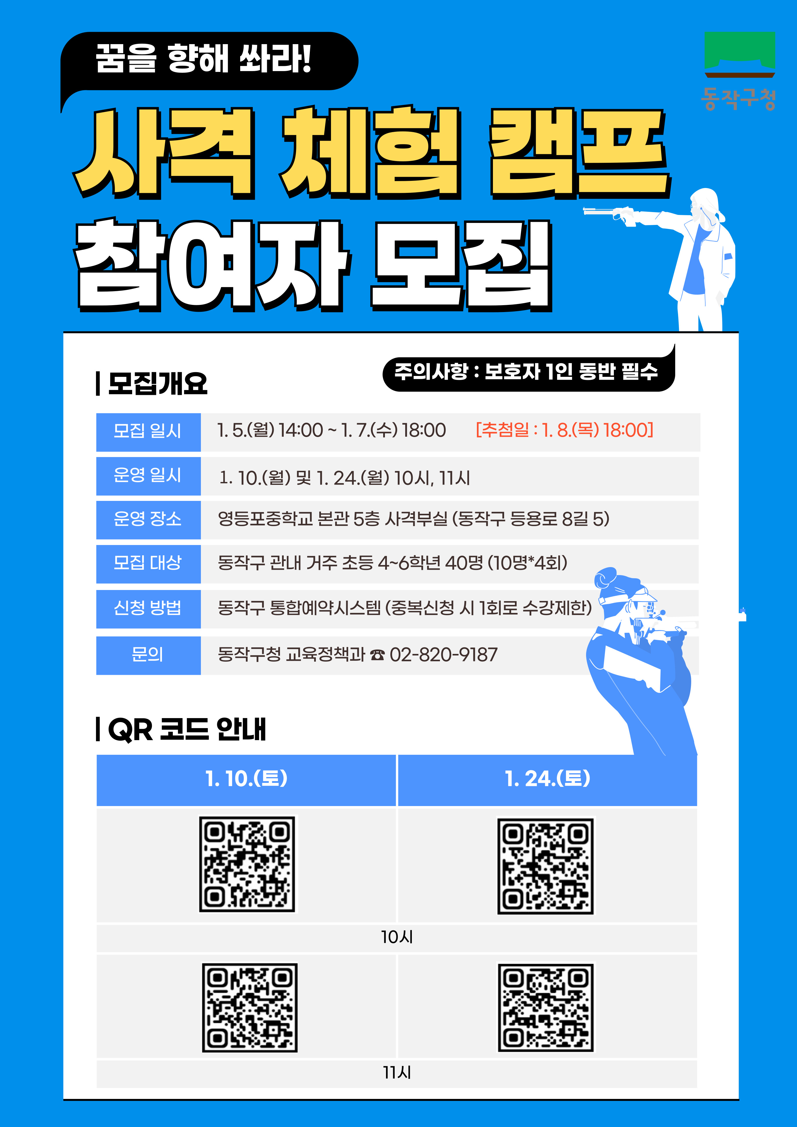 [1. 10. / 1. 24 수업 모집] 26년 1월 동작구-영등포중 사격 체험 캠프 안내 (초등 4~6학년)