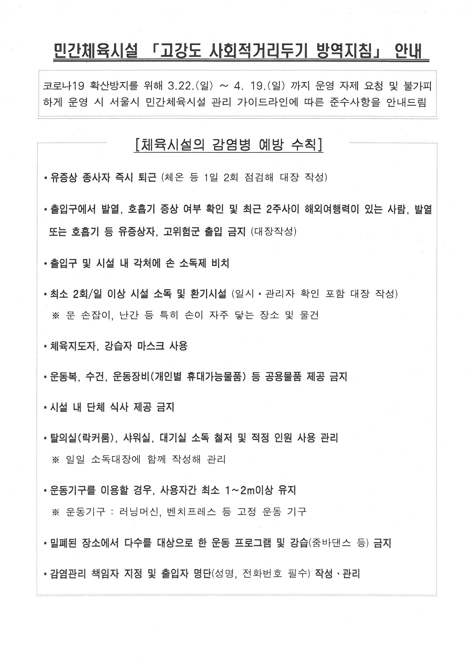 민간체육시설 「고강도 사회적거리두기 방역지침」 및 각종서식 안내