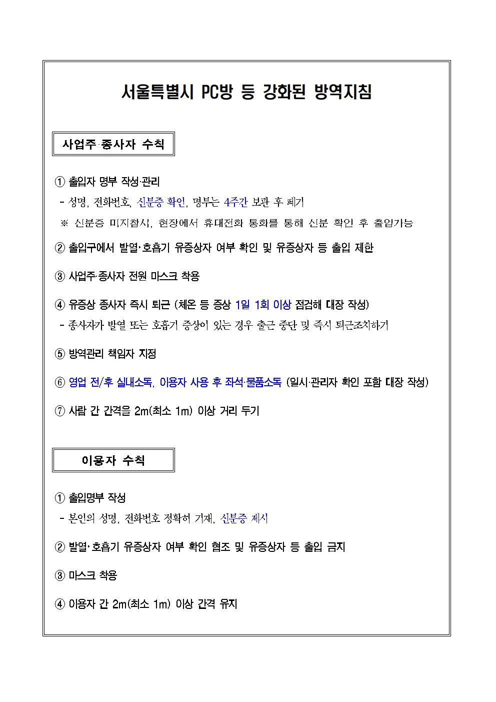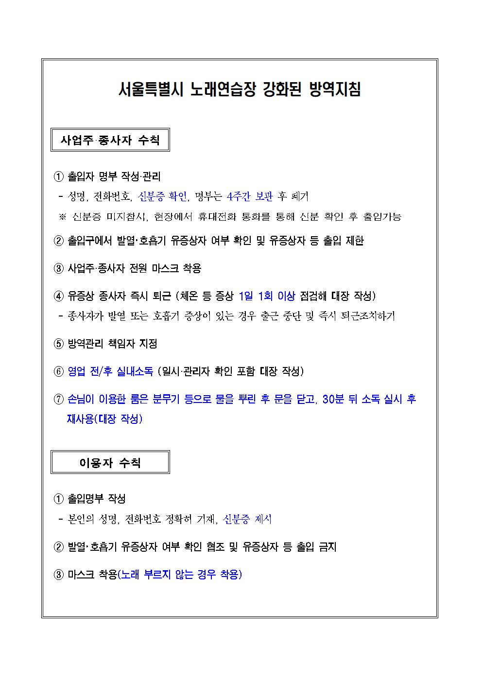 1. 변경된 「강화된 방역지침」(신분증 확인, 명부 4주 보관, 종사자 체온 1일1회 체크, 이용자 수칙 등)을 안내하오니 방역지침을 지키지 않았을 경우 사업주, 이용자 벌금 각300만원 이하 부과가 가능한 점을 유념하시어 지침을 잘 준수하여 주시고,