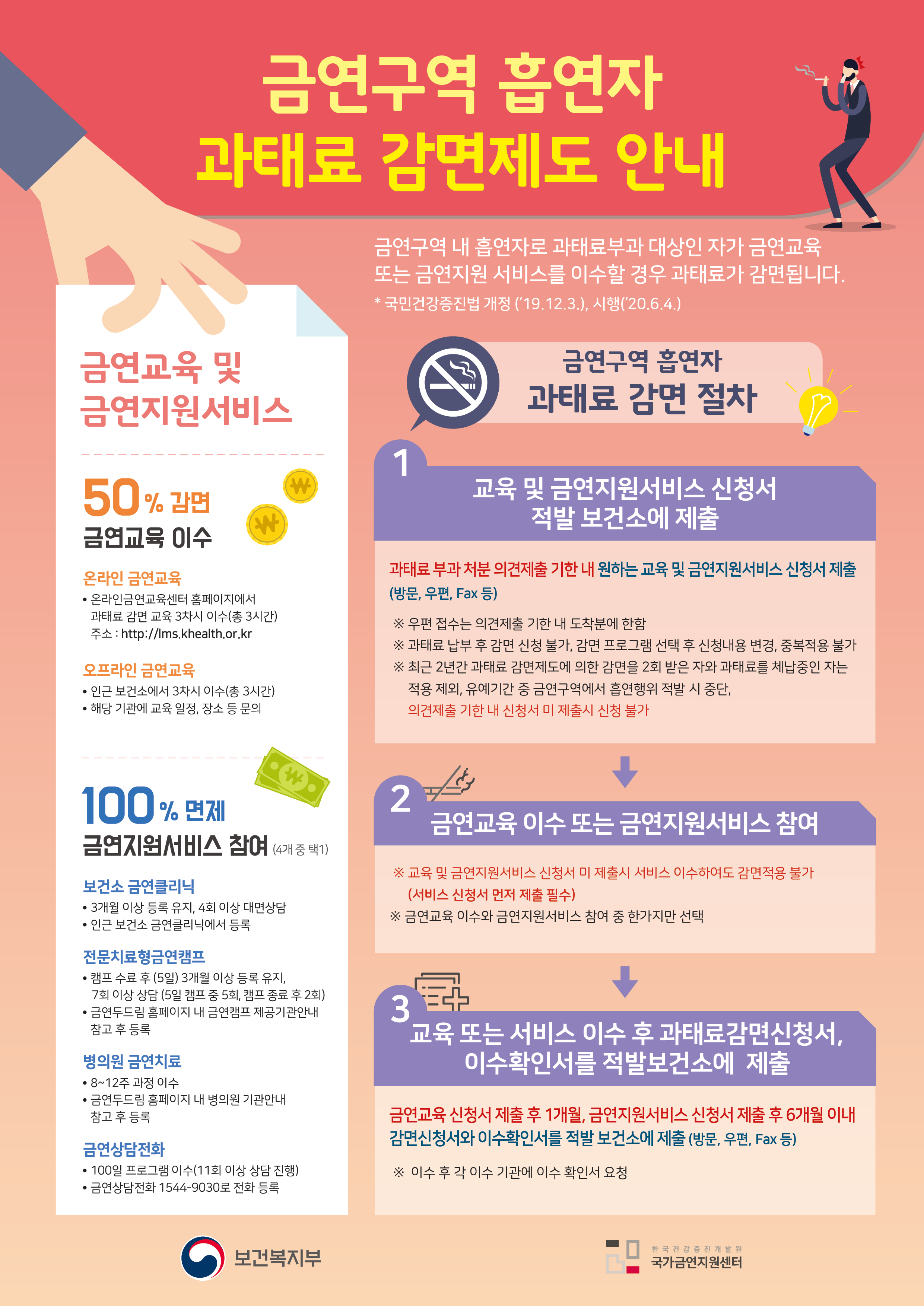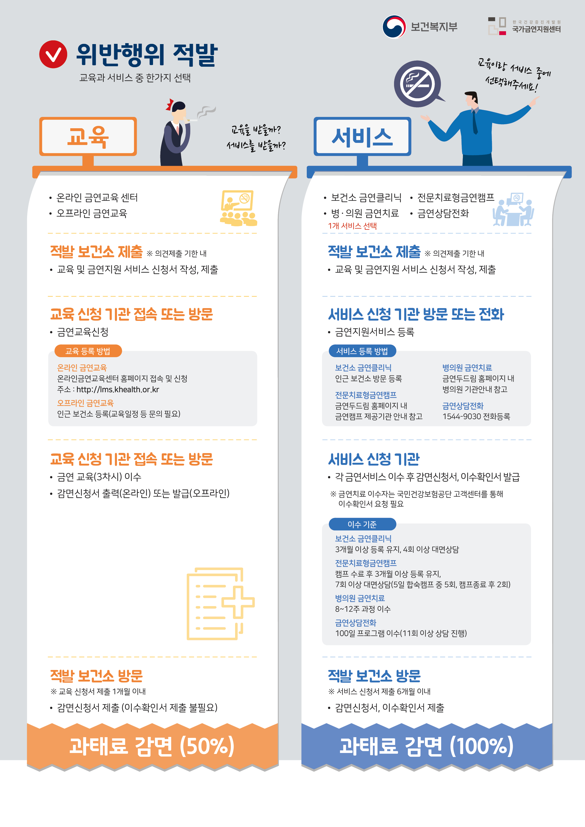 1. 금연교육(50% 감경, 10만원→5만원), 금연지원서비스(100% 감경, 면제) 중 1가지 선택 가능