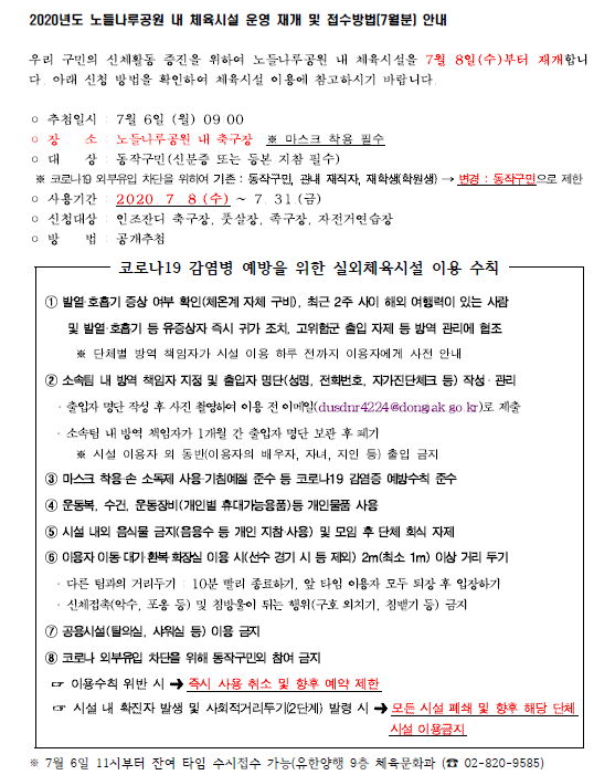 2020년도 노들나루공원 내 체육시설 운영 재개 및 접수방법(7월분) 안내