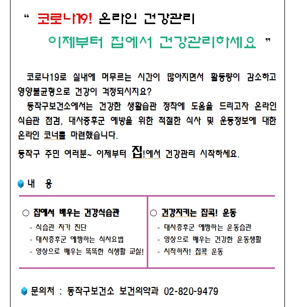 코로나19 온라인 건강관리 : https://www.dongjak.go.kr/healthcare/main/contents.do?menuNo=300325