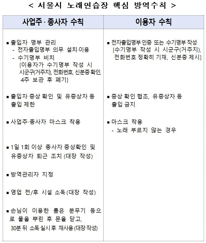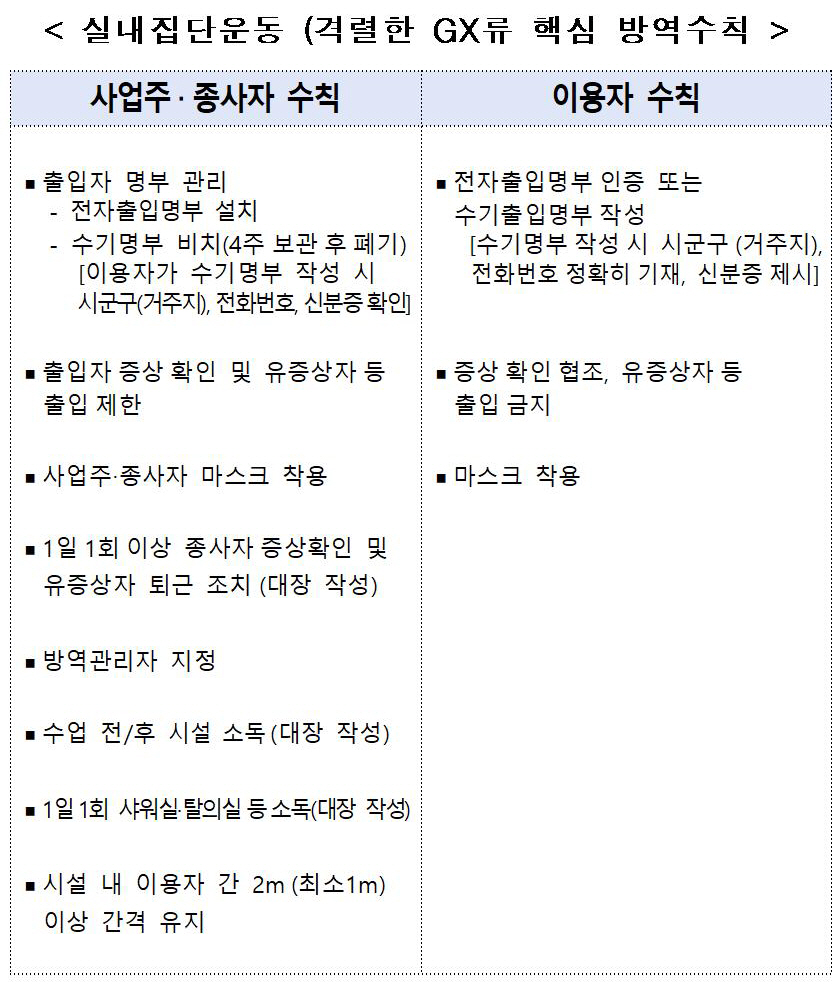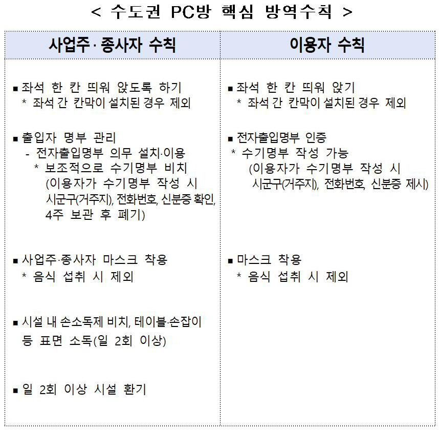 PC방, 노래연습장, 격렬한 GX류가 집합제한으로 변경되었기에 핵심 방역수칙을 게시하오니