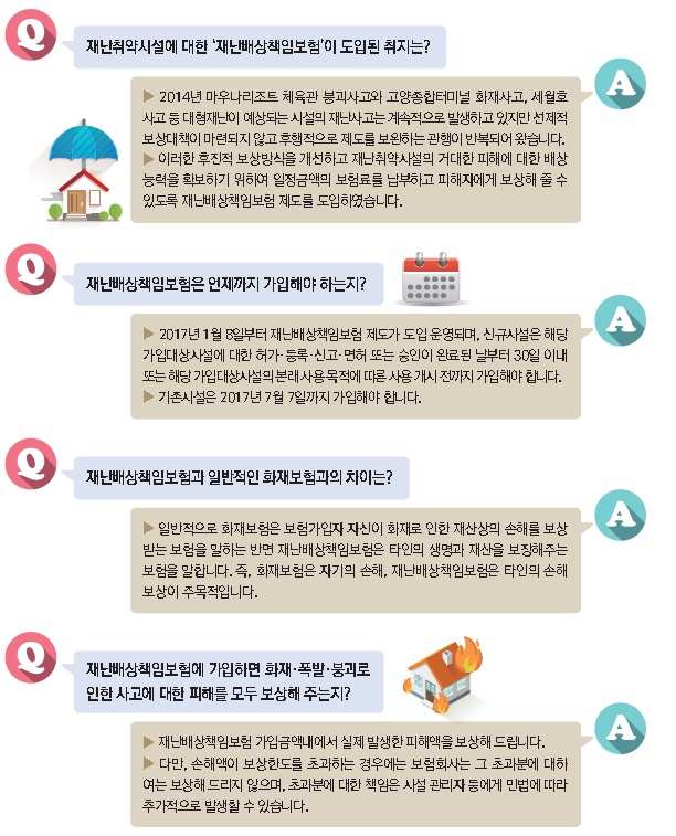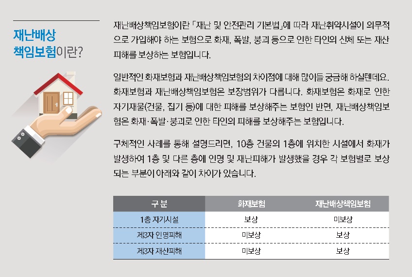 장례식장은 재난안전법 제76(재난 보험등의 가입 등) 및 동법 시행령 제83조의2에 의거 재난배상책임보험 의무 가입 시설로 규정되었으며,