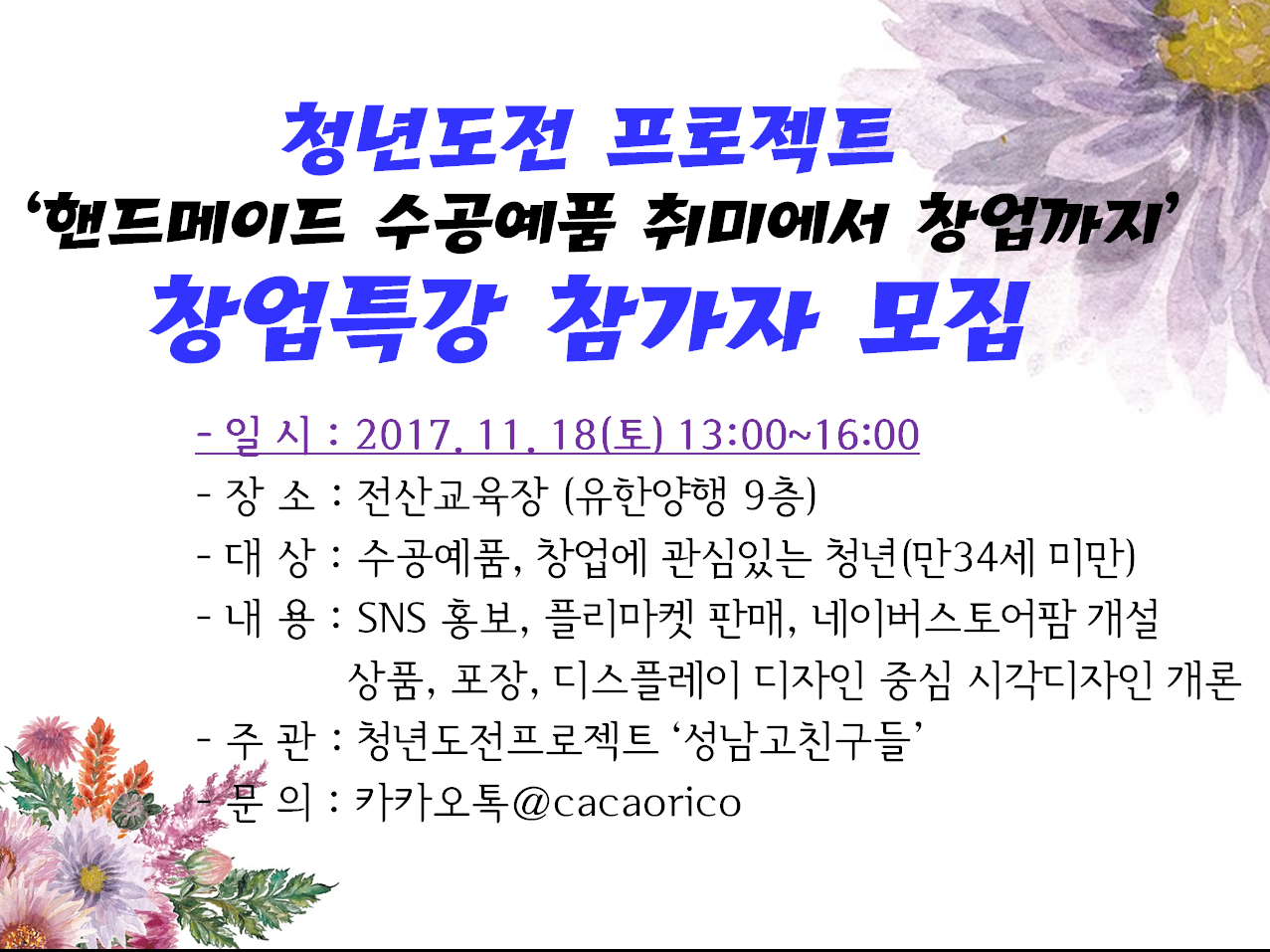 청년도전 프로젝트 ‘핸드메이드 수공예품 취미에서 창업까지’ 창업특강 참가자 모집