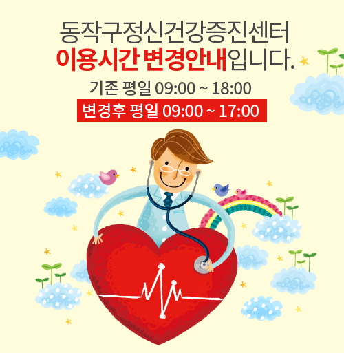 동작구정신건강증진센터 이용시간이   변경되었으니 센터 이용에 착오없으시길 바랍니다.