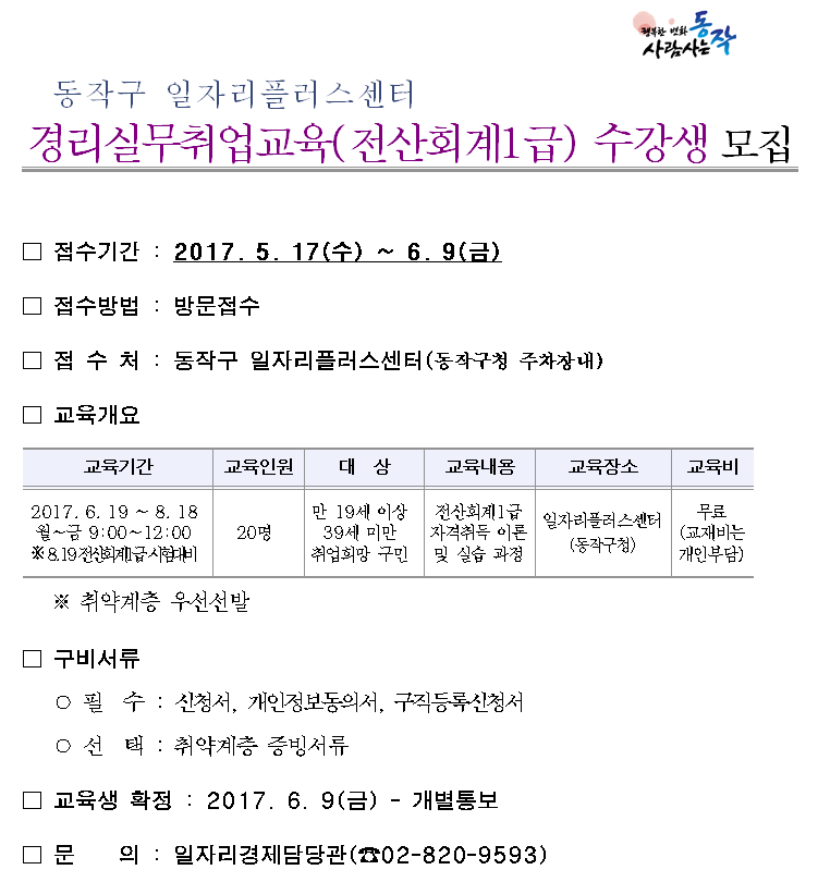 경리실무취업교육(전산회계1급) 교육생 모집(~6.9)