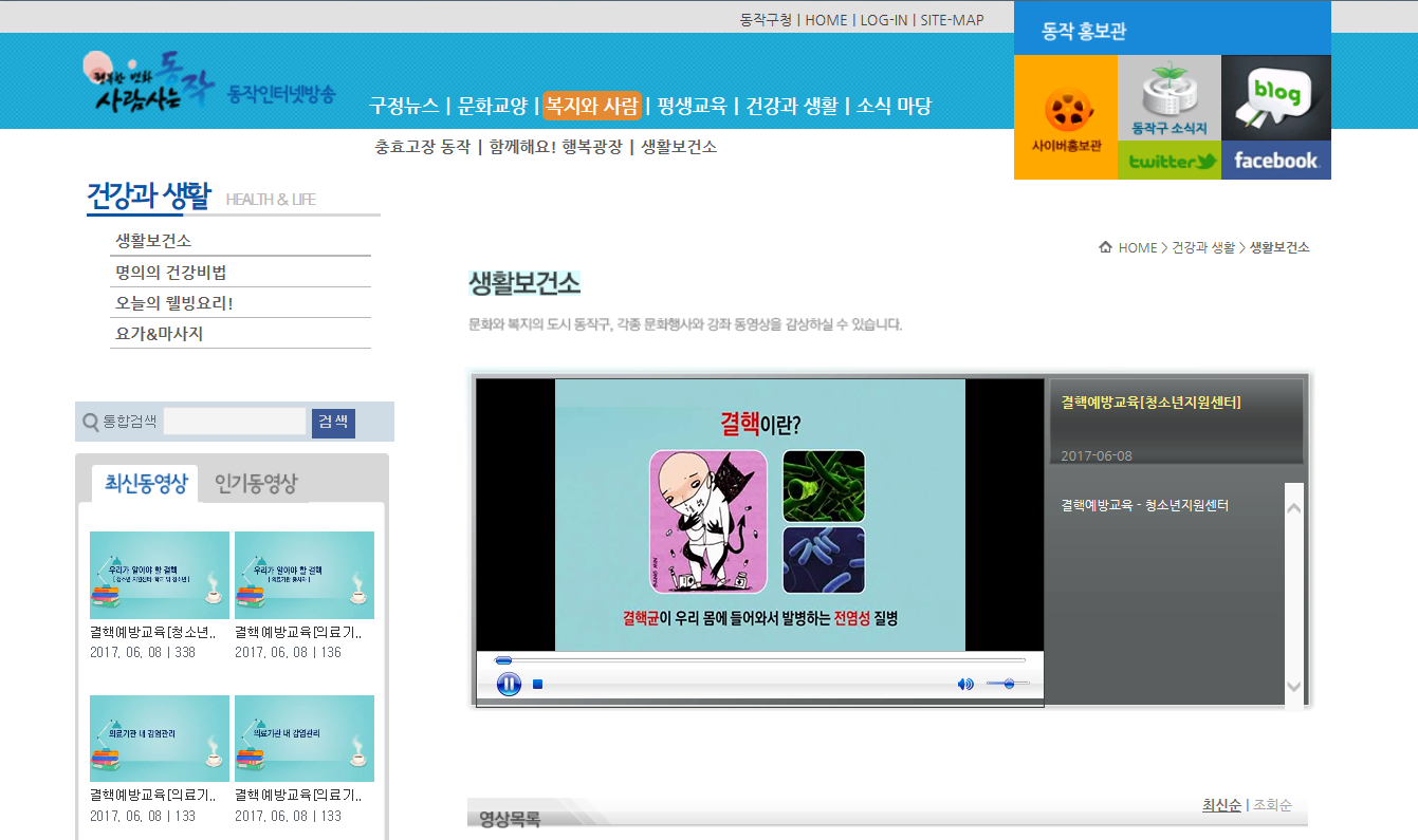 2016년 8월에 개정된 결핵예방법 제11조 및 같은 법 시행 규칙 제4조의 2에 따라 집단시설의 장은 결핵감염 예방교육을 정기적으로 실시하고 결핵관리 기준에 관한 사항을 작성 비치하도록 규정하고 있습니다. 이에 결핵감염 예방교육 사이트 주소를 안내하오니 교육에 참고하시기 바랍니다. * 접속주소 http://www.dongjak.go.kr/media/main/main.do→ 인터넷방송국 → 건강과생활 → 생활보건소