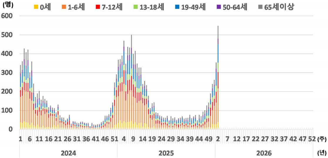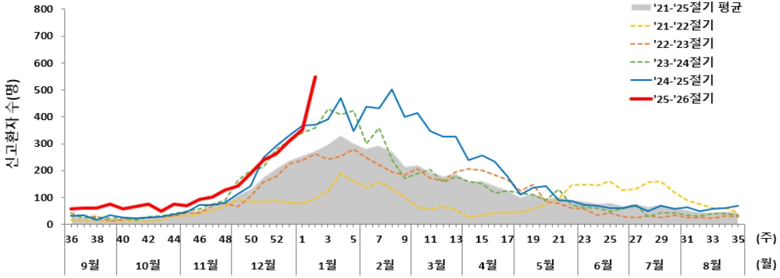 * 최근 5주 발생 : (‘25. 12월 2주) 190명 → (3주) 240명 → (4주) 262명 → (’26년 1월 1주) 354명 → (2주) 548명