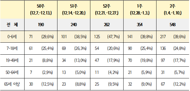 * 연령별 비율(1월 2주 기준) : (0~6세) 39.6%, (7~18세) 24.8%, (19~49세) 17.7%, (50~64세) 5.7%, (65세 이상) 12.2%