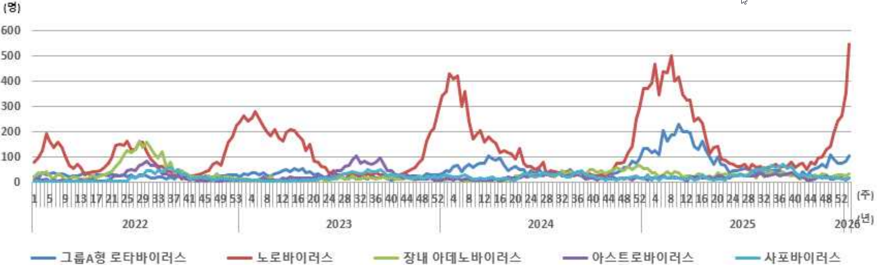 - 2025.1.16.기준 최근 5년 내 노로바이러스 감염증 환자 수 최대수준(‘26년 2주, 548명)