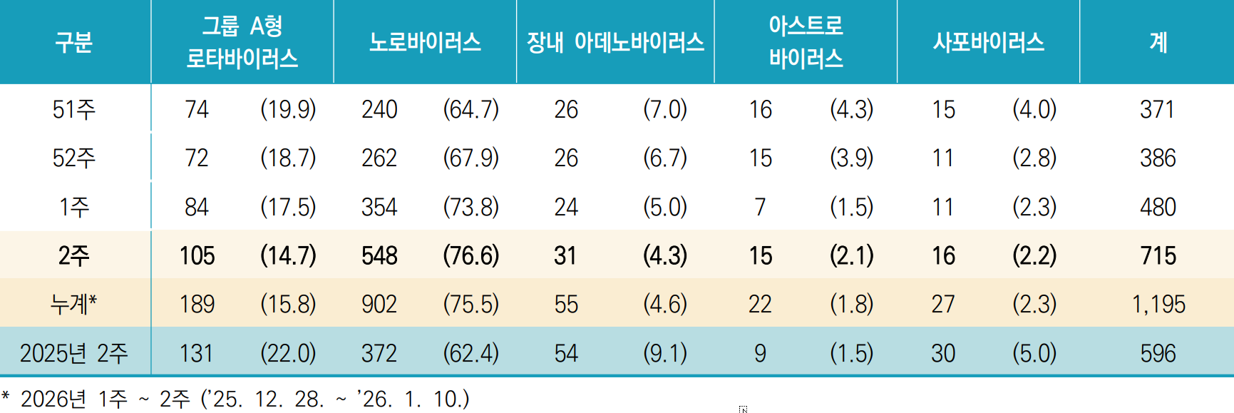 【 최근 4주간 바이러스성 장관감염증 신고현황(‘26. 2주 기준, 명(%) 】 |