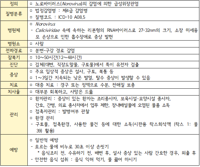 - 노로바이러스(Norovirus) 감염에 의한 급성위장관염으로 제4급 감염병