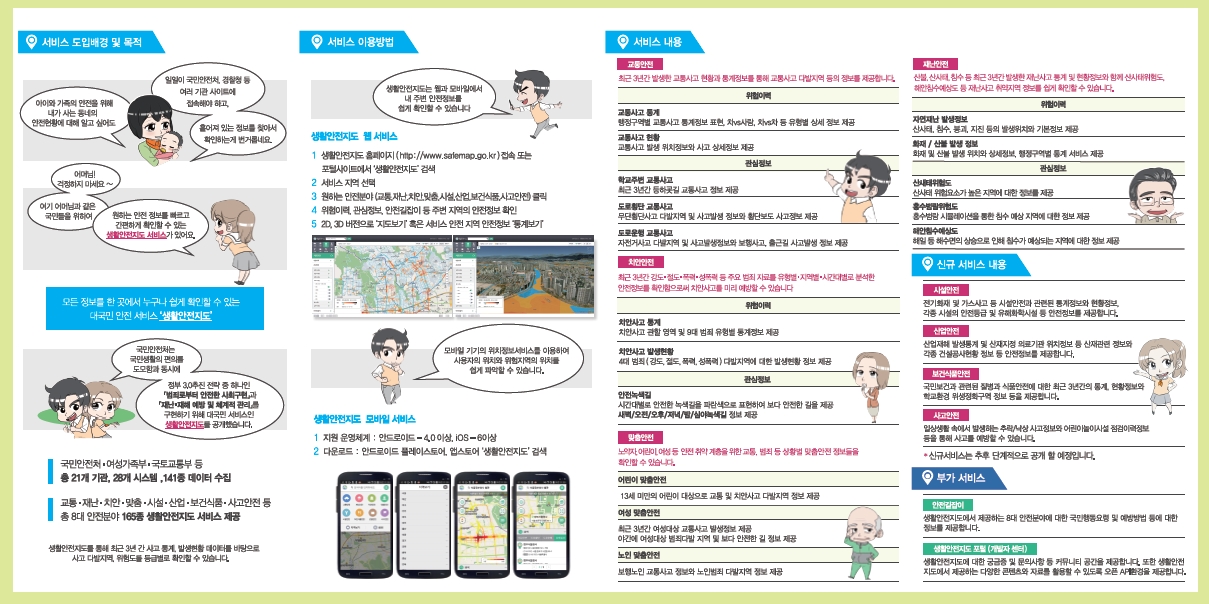 □국민생활과 밀접한 4대 안전분야(치안·교통·재난·맞춤안전) 생활안전지도가 115개 시군구로 확대서비스 됩니다. □생활안전지도 홍보 리플릿