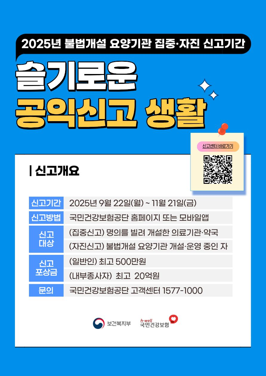 보건복지부 산하 국민건강보험공단은 국민의 건강을 침해하고 건강보험 재정을 누수시킬 우려가 있는 사무장병원 등 불법 개설 의료기관에 대한 집중 신고 기간을 운영하고 있습니다.