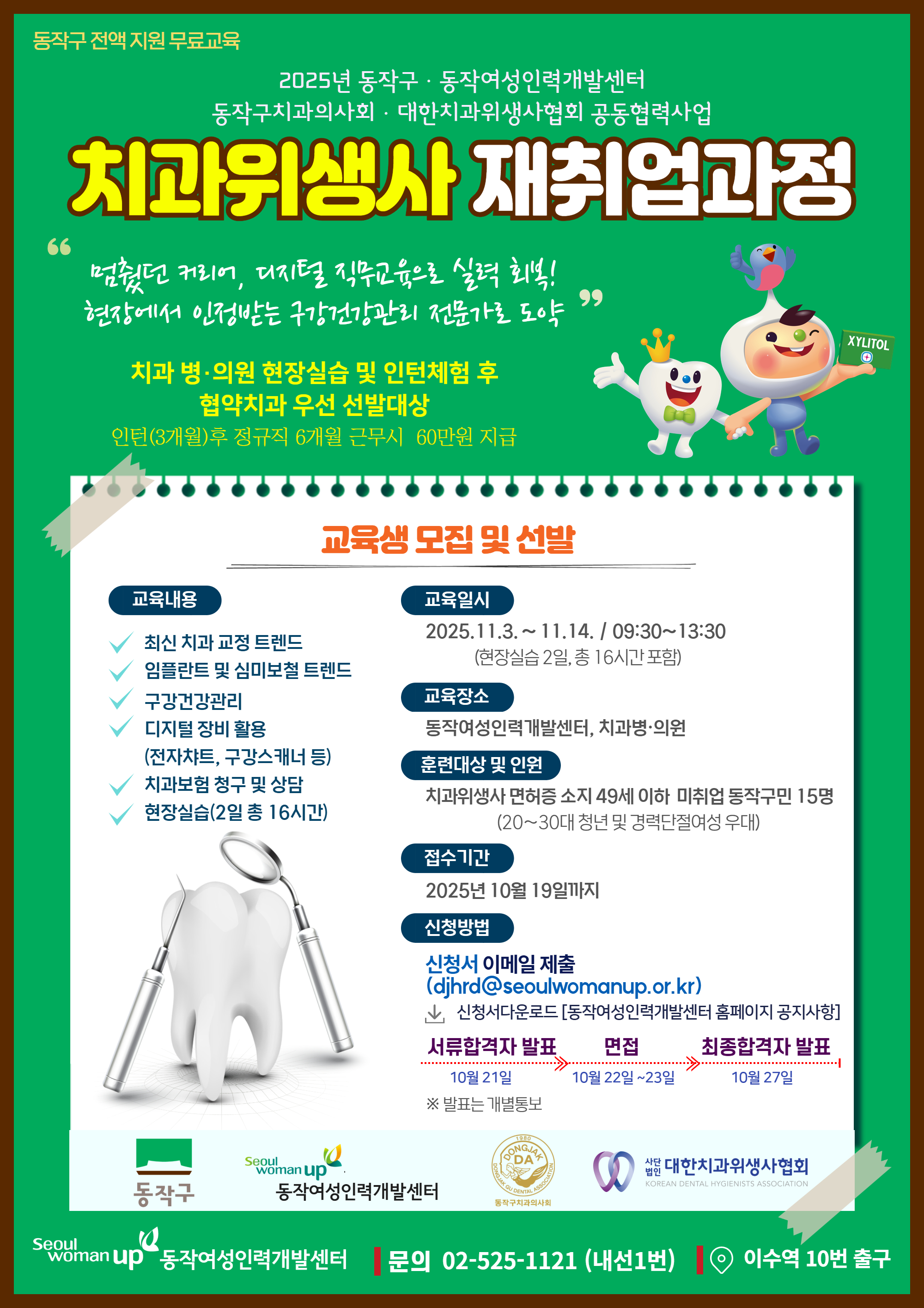 [동작구 전액지원] ‘치과위생사 재취업과정’ 무료교육에 참여하세요