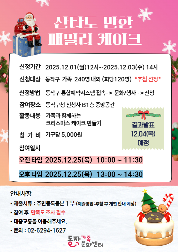 동작가족문화센터에서는 가족친화 프로그램으로 크리스마스 케이크 만들기 활동을 아래와 같이 진행하오니,