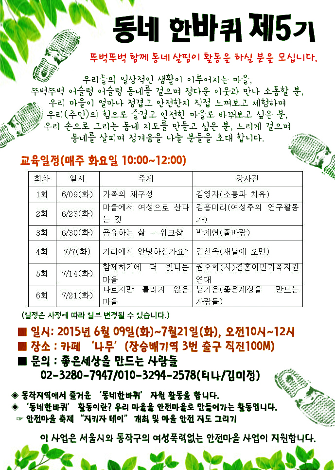 2015년 동작구 여성폭력 없는 안전마을 활동가 모집 및 교육일정 안내