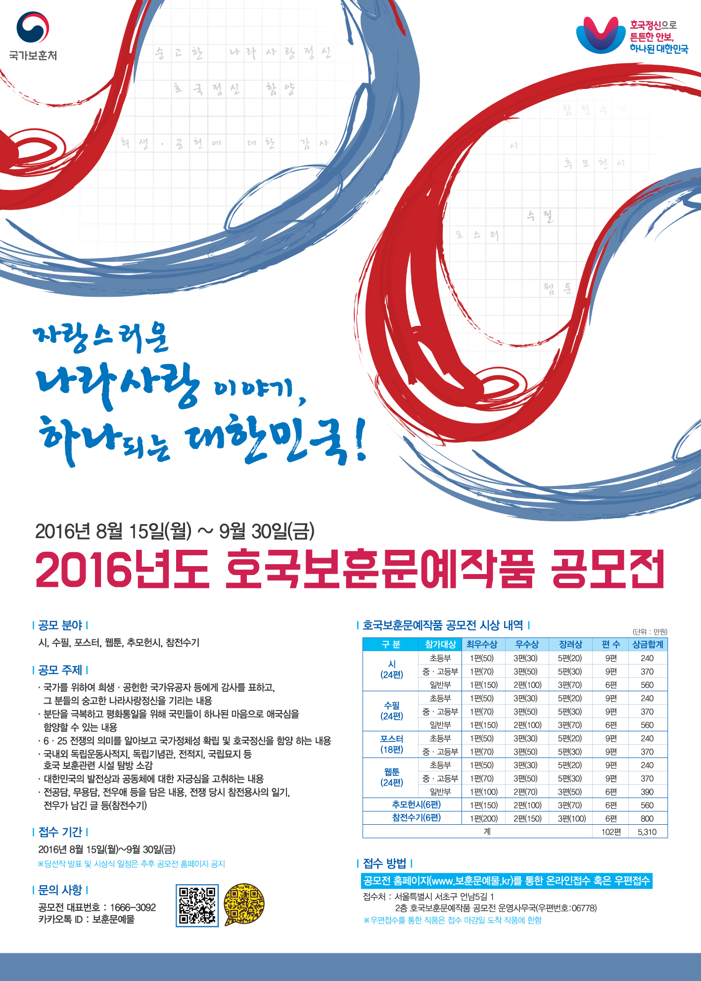 국가보훈처에서 국가를 위하여 희생하거나 공헌한 분들의 숭고한 애국정신을 선양하고 국민들의 나라사랑정신을 고취하고자 ’2016년도 호국보훈문예작품 공모전’을 개최하오니 많은 참여 바랍니다.