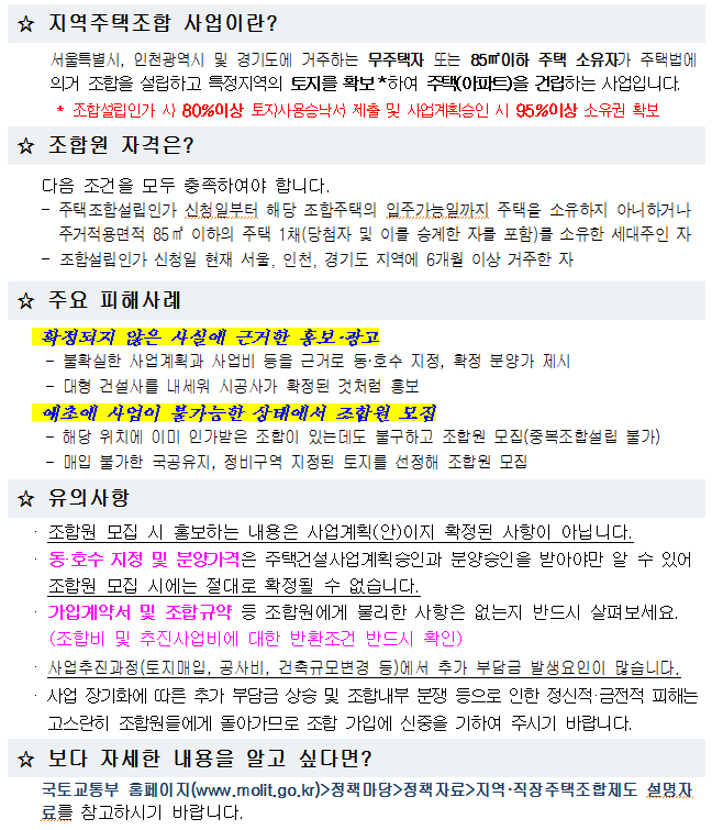 최근 부동산 경기 활황에 힘입어 지역주택조합 대행사가 사업 대상지를 물색해 시공사를 선정하고, 조합원을 모집하는 과정에서 마치‘아파트 분양’처럼 허위·과장 광고하는 사례가 빈번하게 발생하고 있습니다. 가입 전 아래 내용을 꼭! 확인하시기 바랍니다.