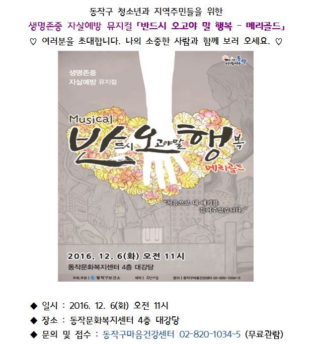 생명존중 자살예방 뮤지컬 「반드시 오고야 말 행복-메리골드」공연 안내