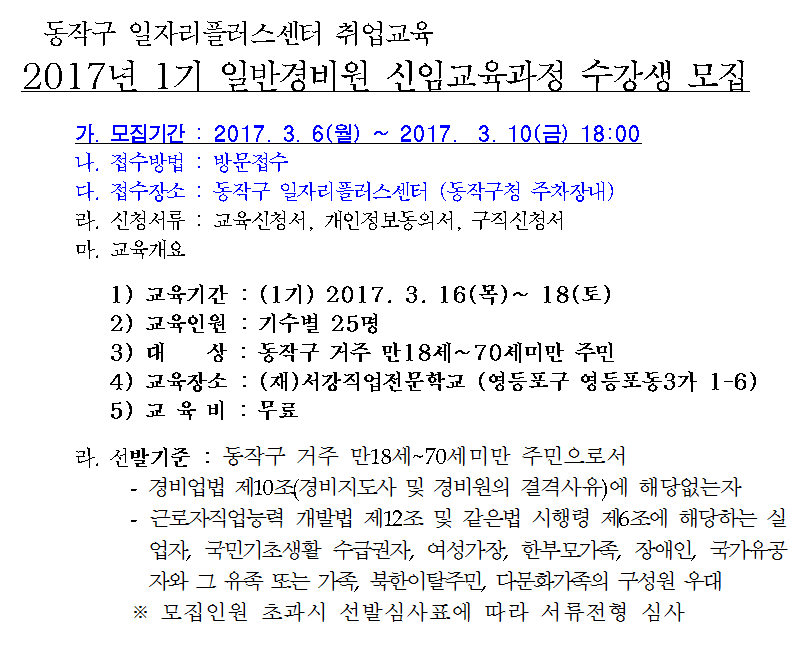 2017년 1기 일반경비원 신임교육과정 수강생 모집