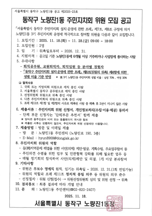 동작구 노량진1동 제3기 주민자치회 위원 추가 모집 공고