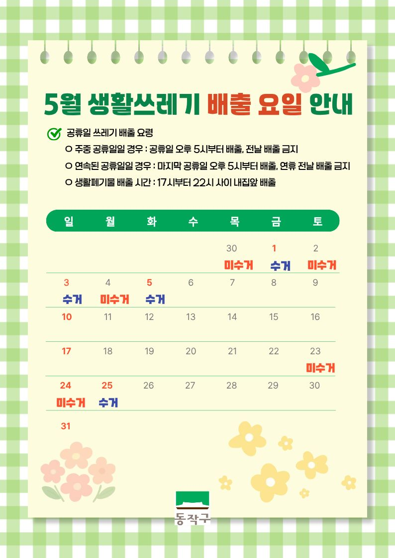 5월 생활쓰레기 배출요일 안내("배출시간"은 언제나 "17시~22시"입니다)