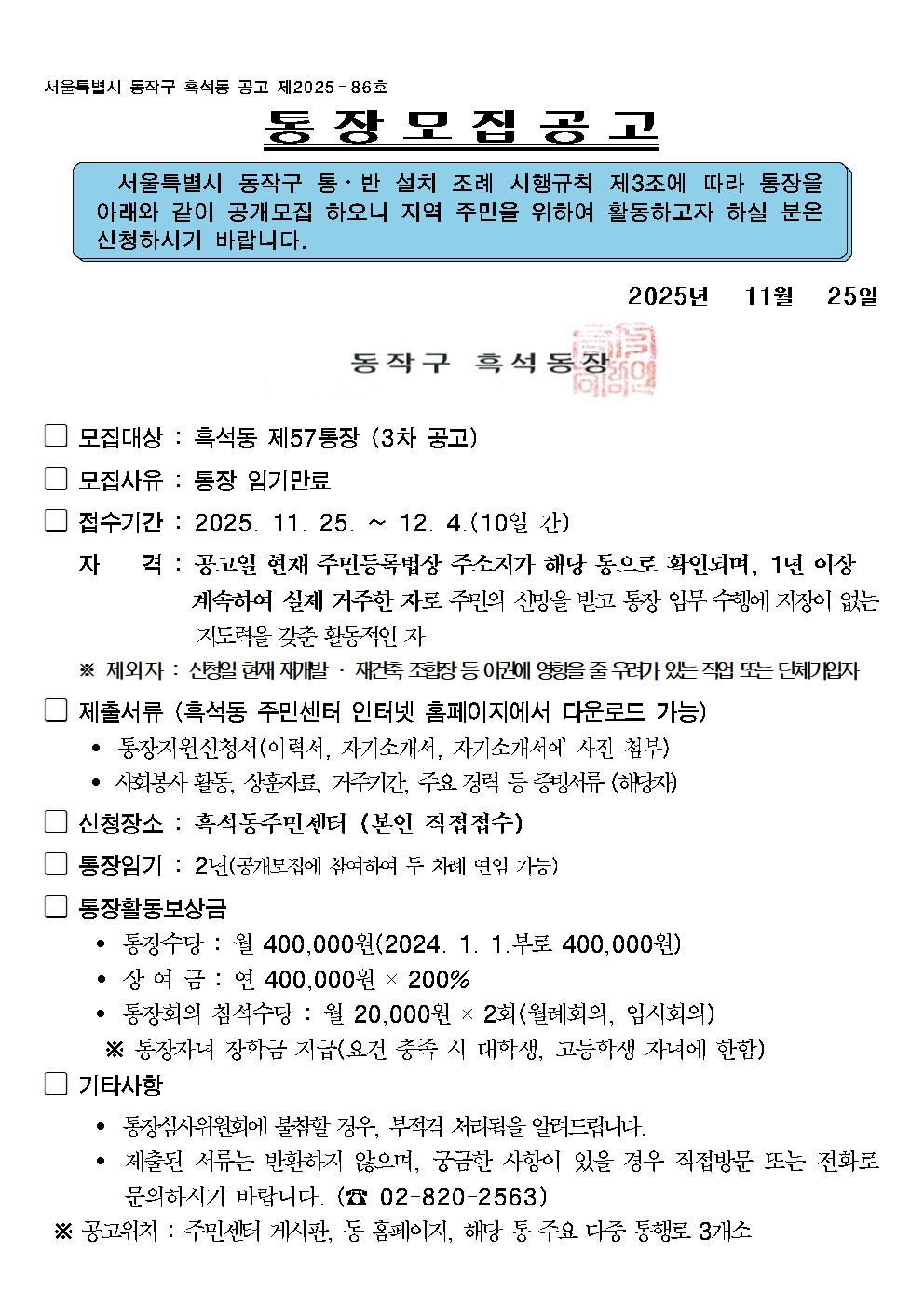 통장 모집 3차 공고(57통)
