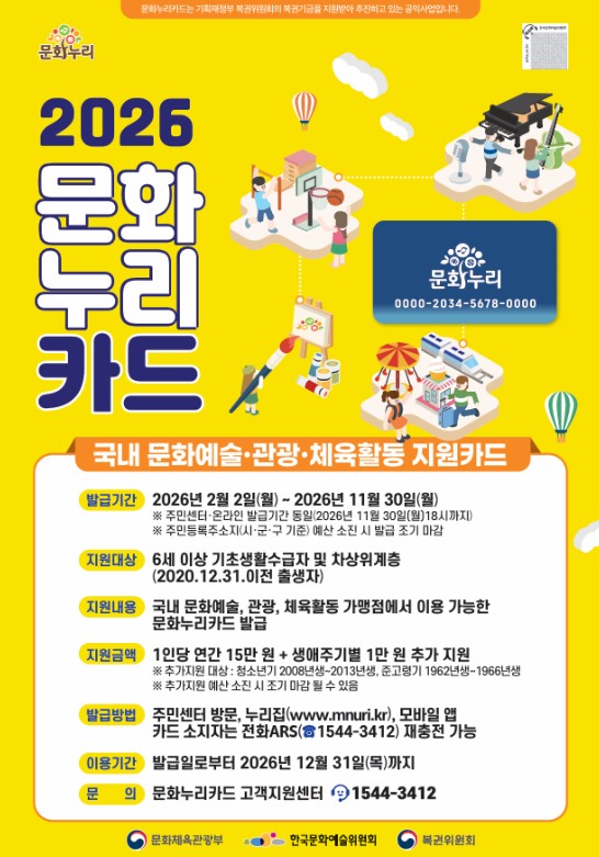 전국 문화예술·국내관광·체육활동 관련 가맹점에서 이용 가능한 문화누리카드 발급