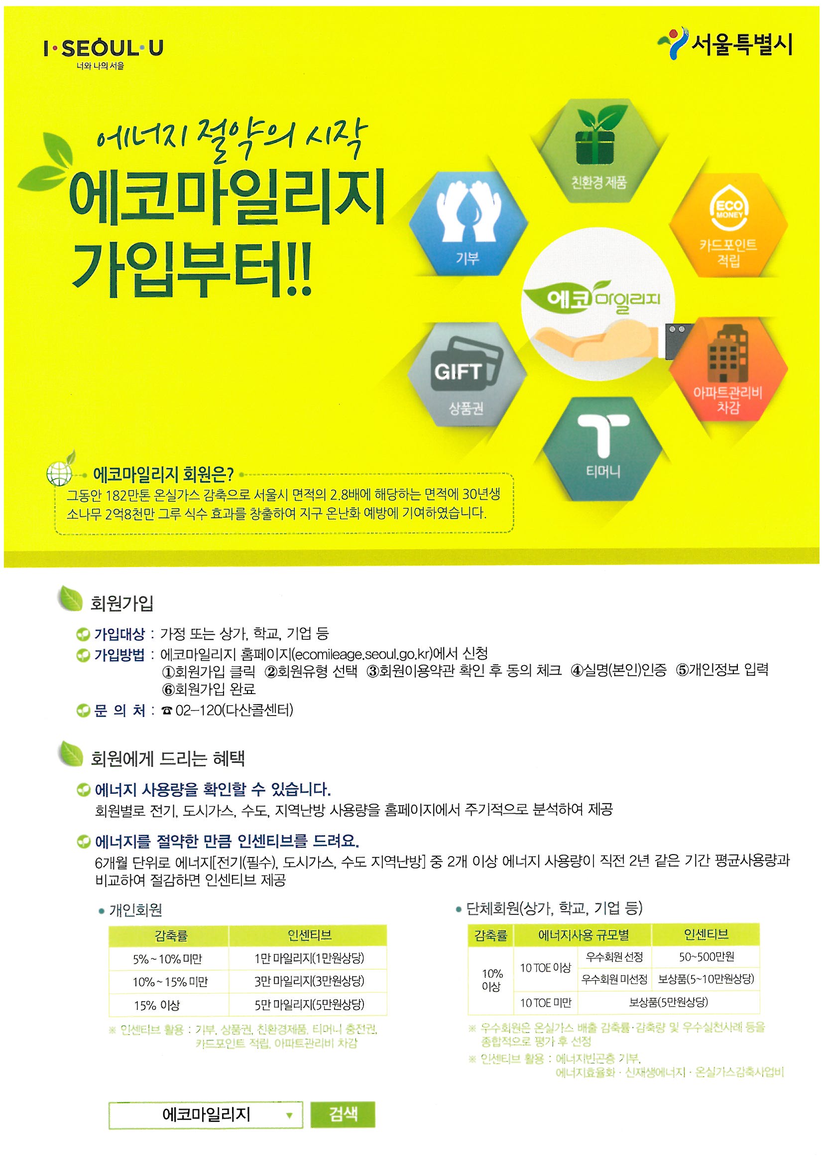 * 가입방법 : 에코마일리지 홈페이지(ecomileage.seoul.go.kr) 가입 또는 동주민센터에 신청서 제출