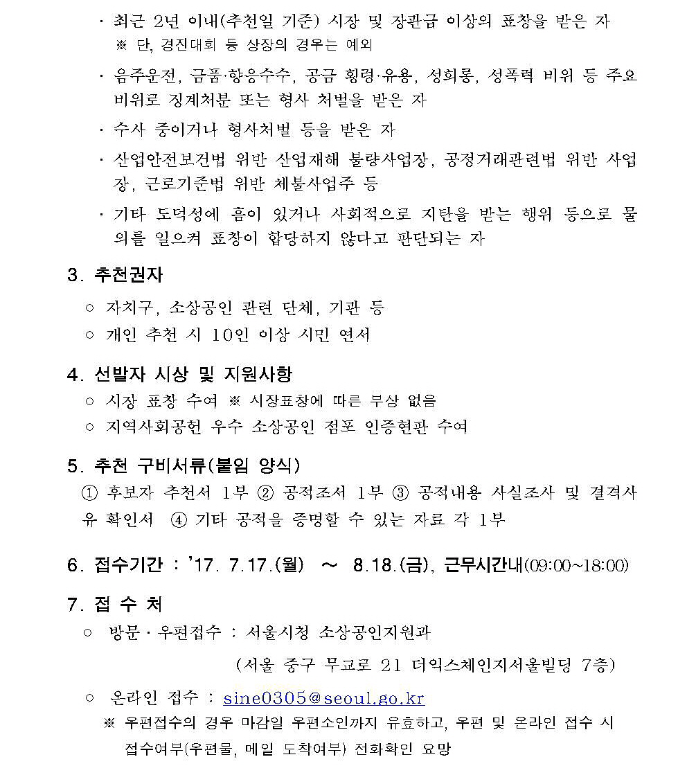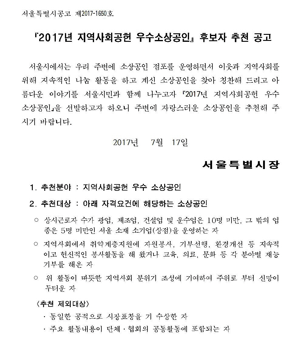 「2017년 지역사회공헌 우수소상공인」 후보자 추천 공고