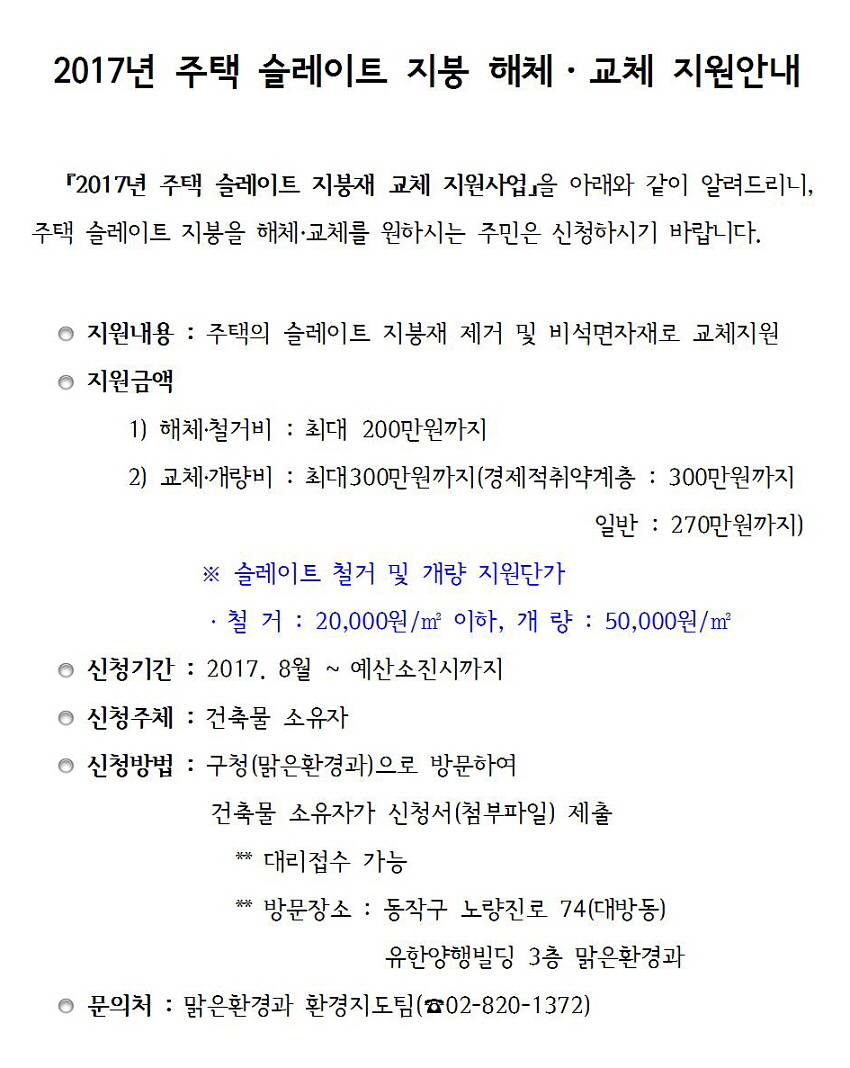 2017년 주택 슬레이트 지붕 해체&교체 지원안내