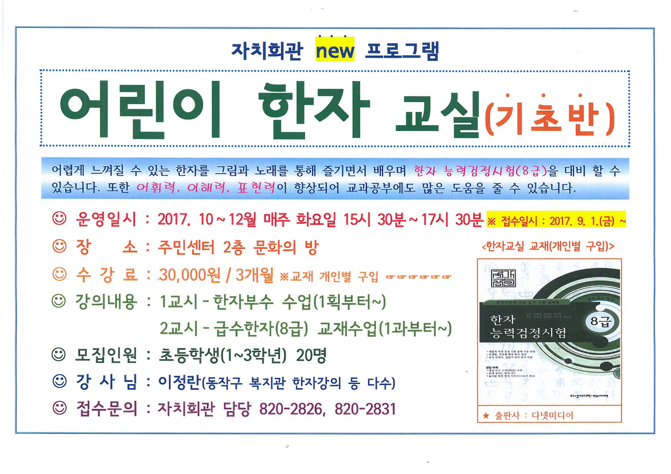 ☆ 2017년 4기(10월~12월) 자치회관 신규 프로그램 "어린이 한자교실" 개설 알림 ☆