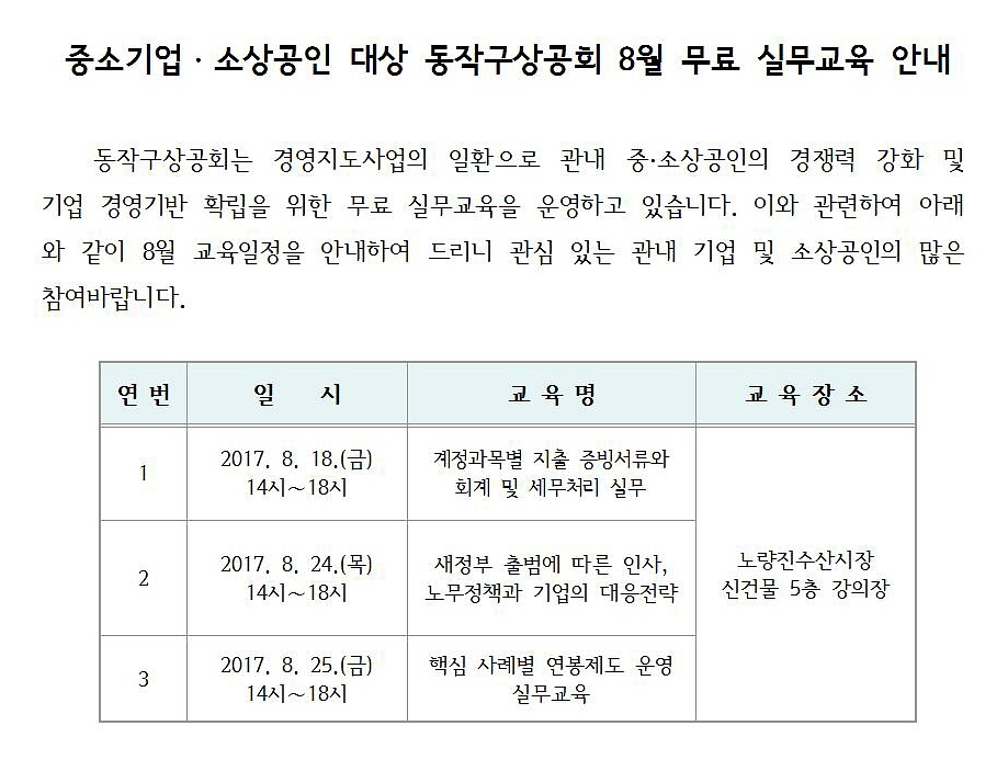 중소기업ㆍ소상공인 대상 동작구상공회 8월 무료 실무교육 안내