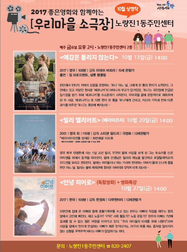 매주 금요일 오후 2시 노량진1동 주민센터 2층 자치회관 다목적실에서 영화를 상영합니다.
