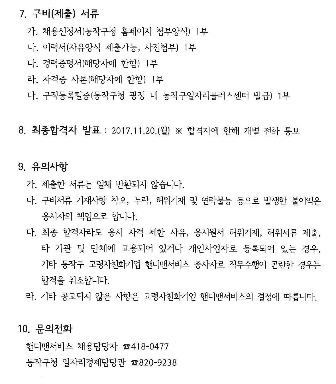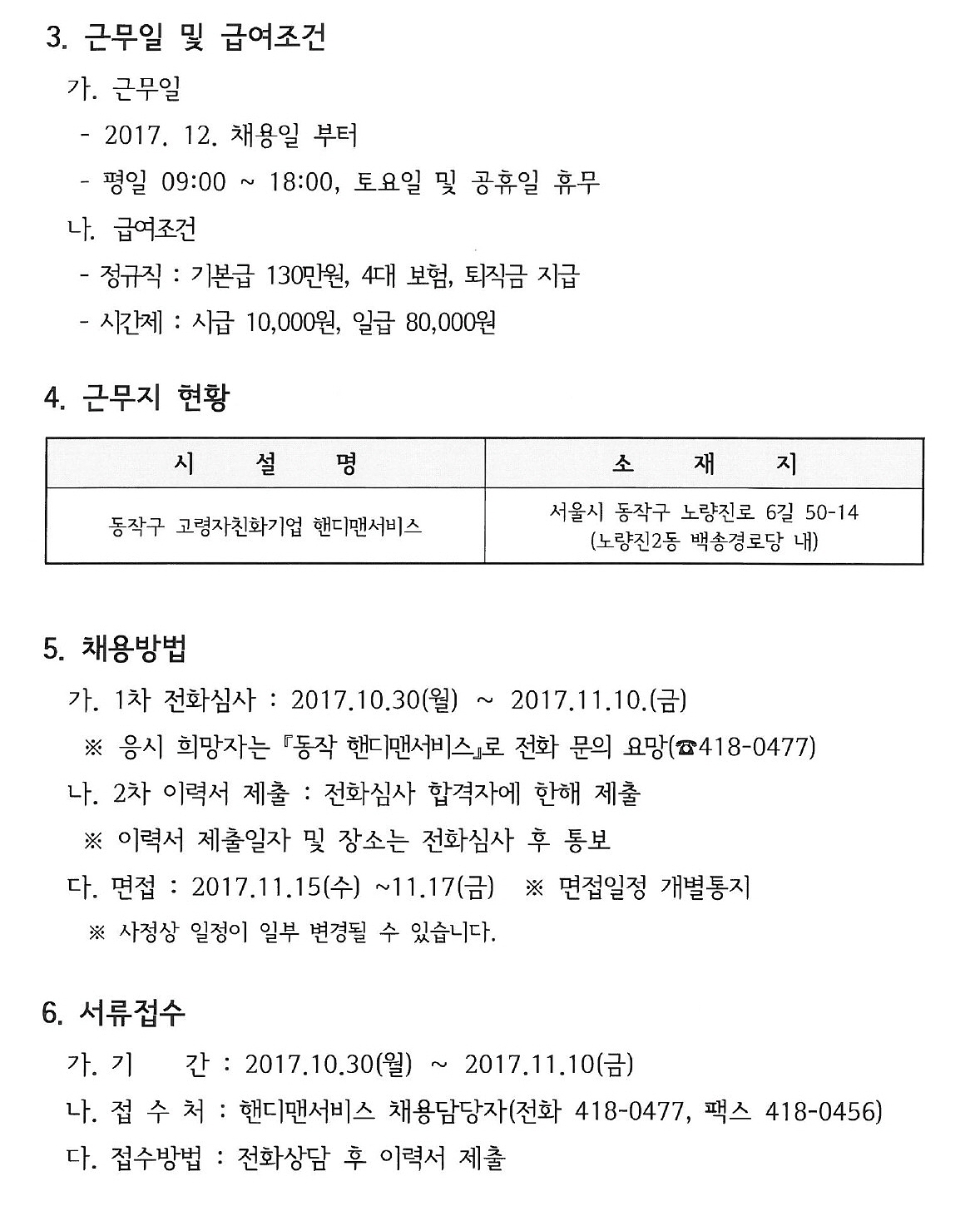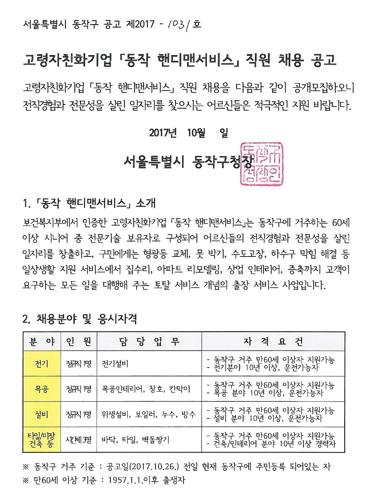 고령자친화기업 「동작 핸디맨서비스」 직원 채용 공고